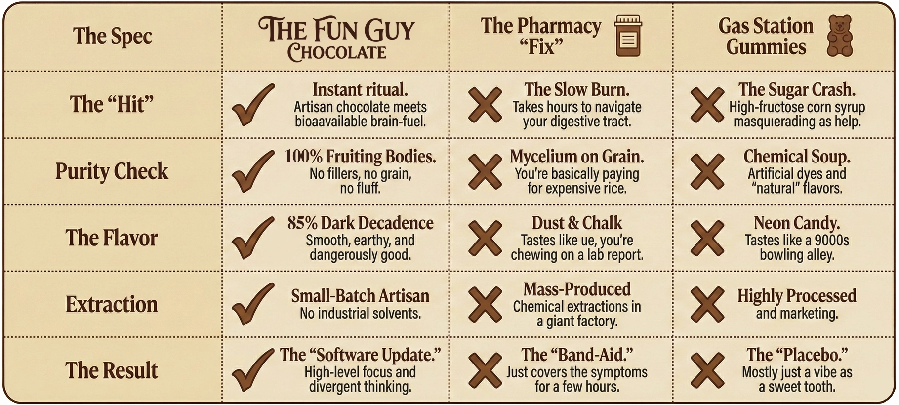 Life is loud. Between the passive-aggressive emails, the "Sunday Scaries," and that 2 AM replay of an awkward conversation from 2014, your system is red-lining. You need the "Fixer." We’ve taken 100% organic Reishi and tucked it into silk-grade 85% dark chocolate. It’s not a sedative; it’s a nervous system hard reset. Strictly legitimate. Strictly peaceful.
